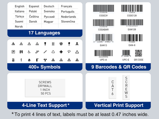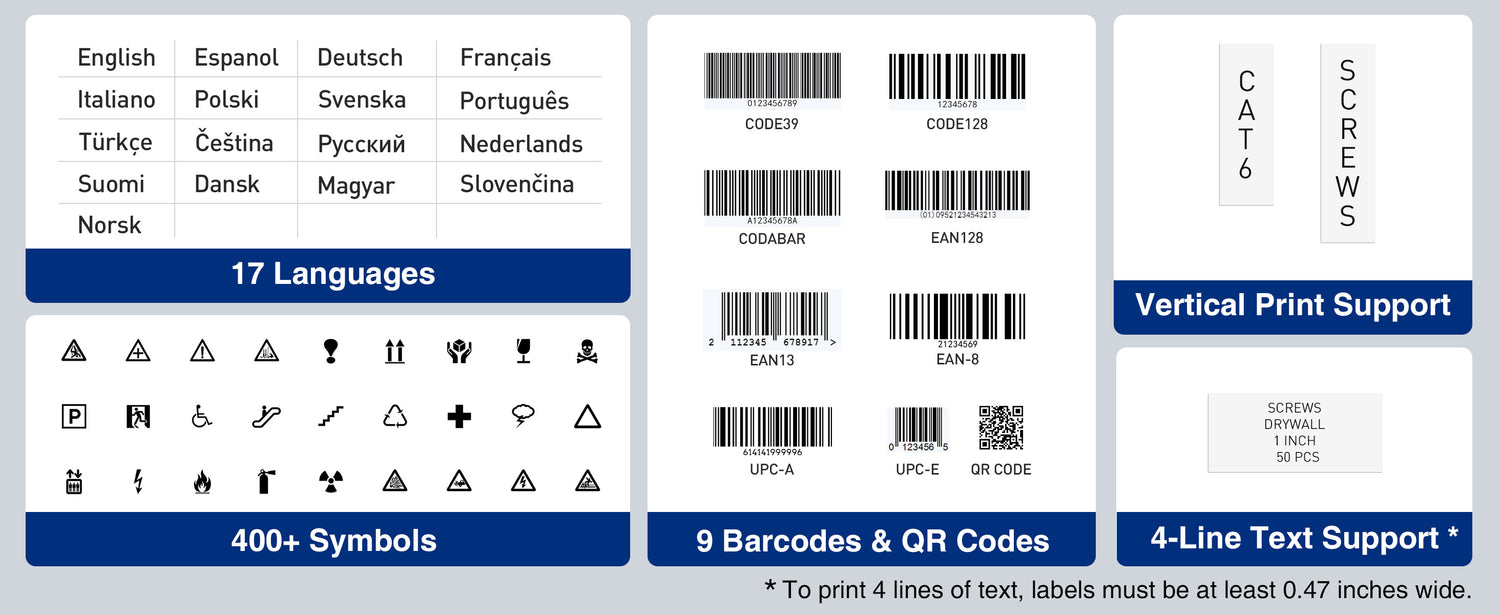 • Fully Customizable Labels: Personalize with 9 font sizes, 6 font styles, 5 frames, and 400+ icons; print multi-color labels with up to 4 lines per label